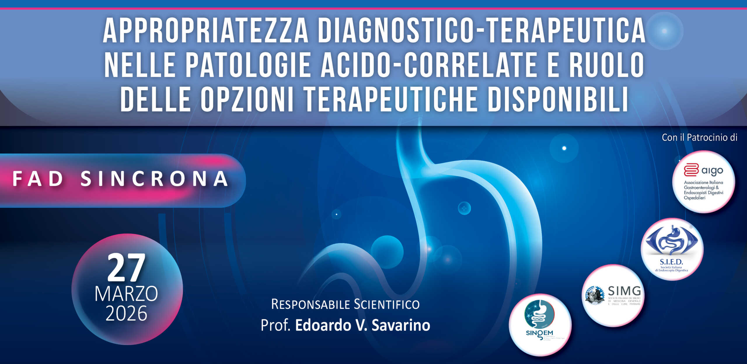 Il 27 marzo 2026 si terrà la FAD sincrona dal titolo “Appropriatezza diagnostico-terapeutica nelle patologie acido-correlate e ruolo delle opzioni terapeutiche disponibili”, con Responsabile Scientifico il Prof. Edoardo V. Savarino